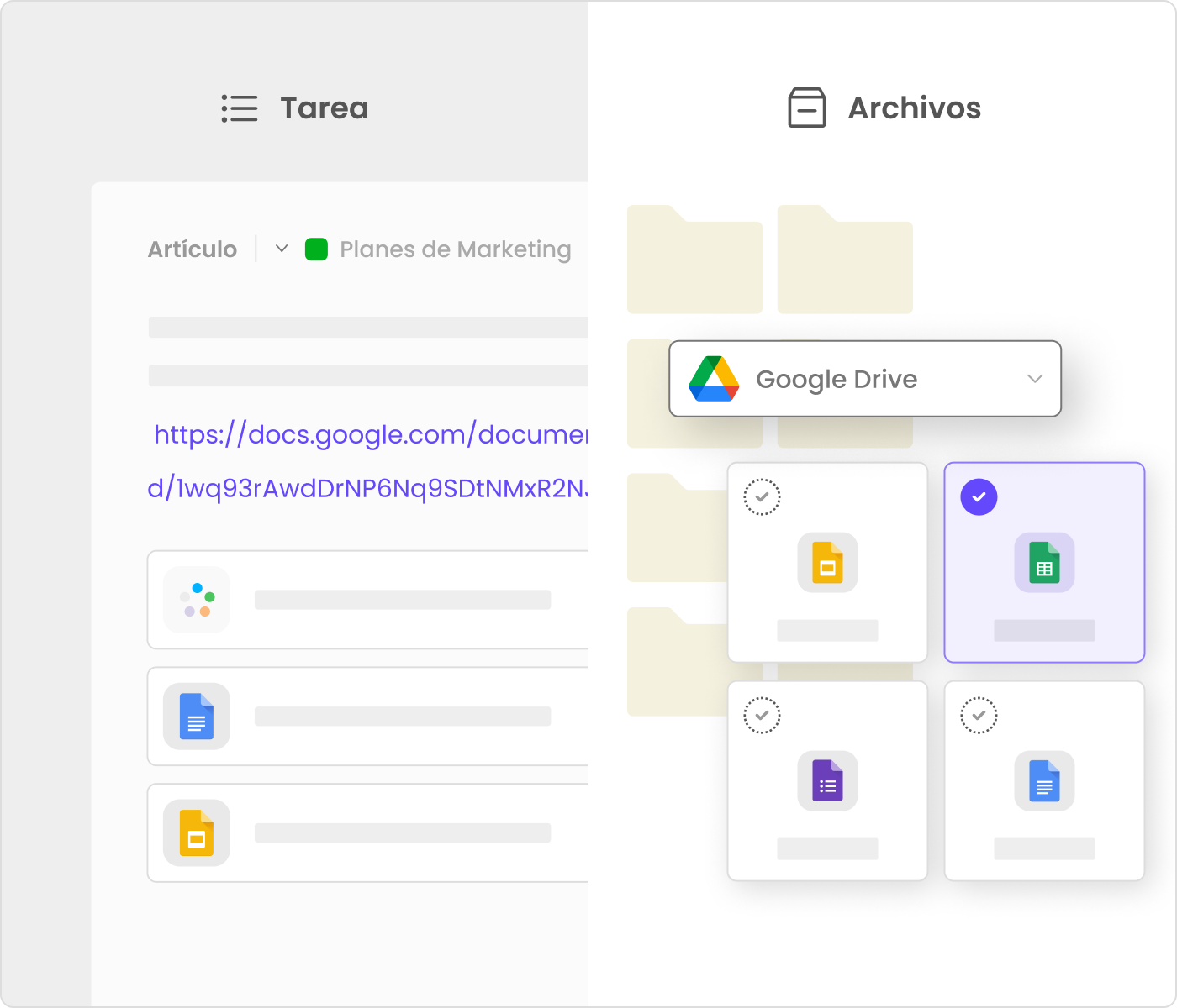 Adjunta archivos fácilmente o inserta links de Google Drive en tus publicaciones o chats.