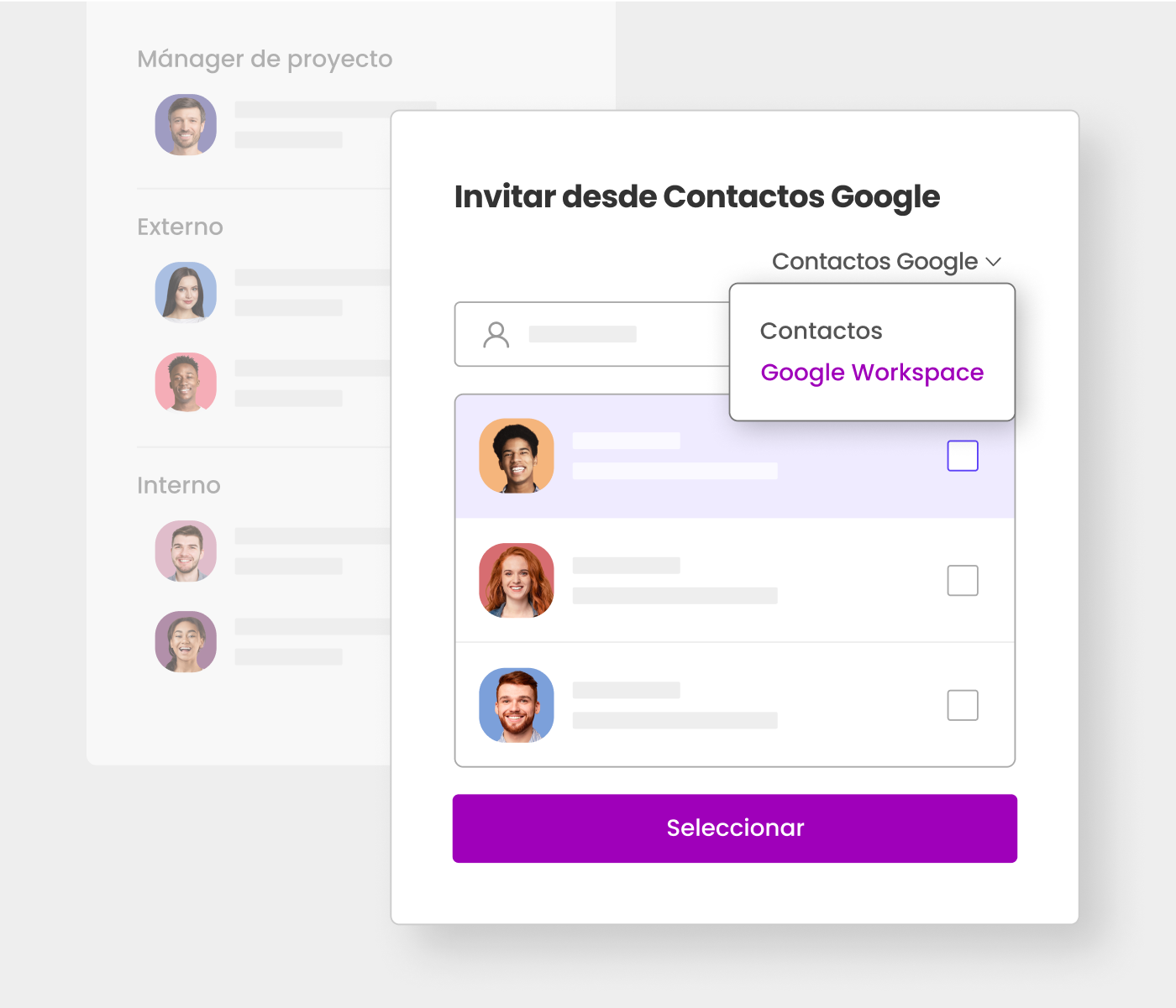 Envía invitaciones directamente a los miembros desde tus contactos de Google o Google Workspace.