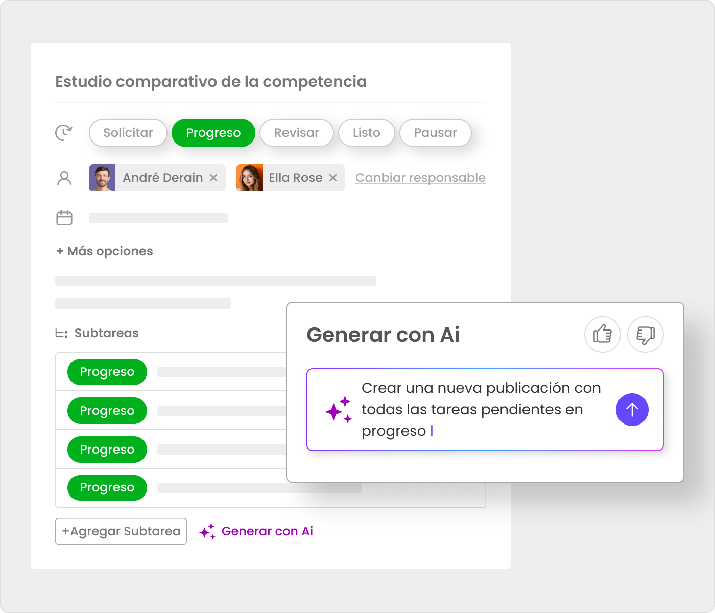 Tareas:Asigna responsables, fija las fechas y prioridad, haz seguimiento del progreso y agrega sub tareas