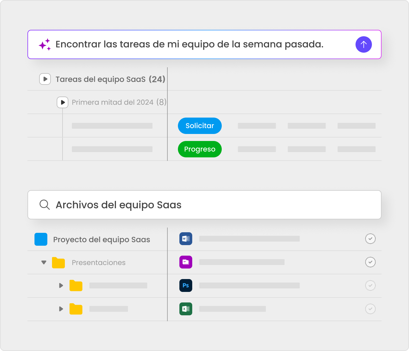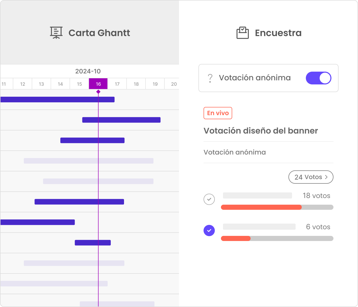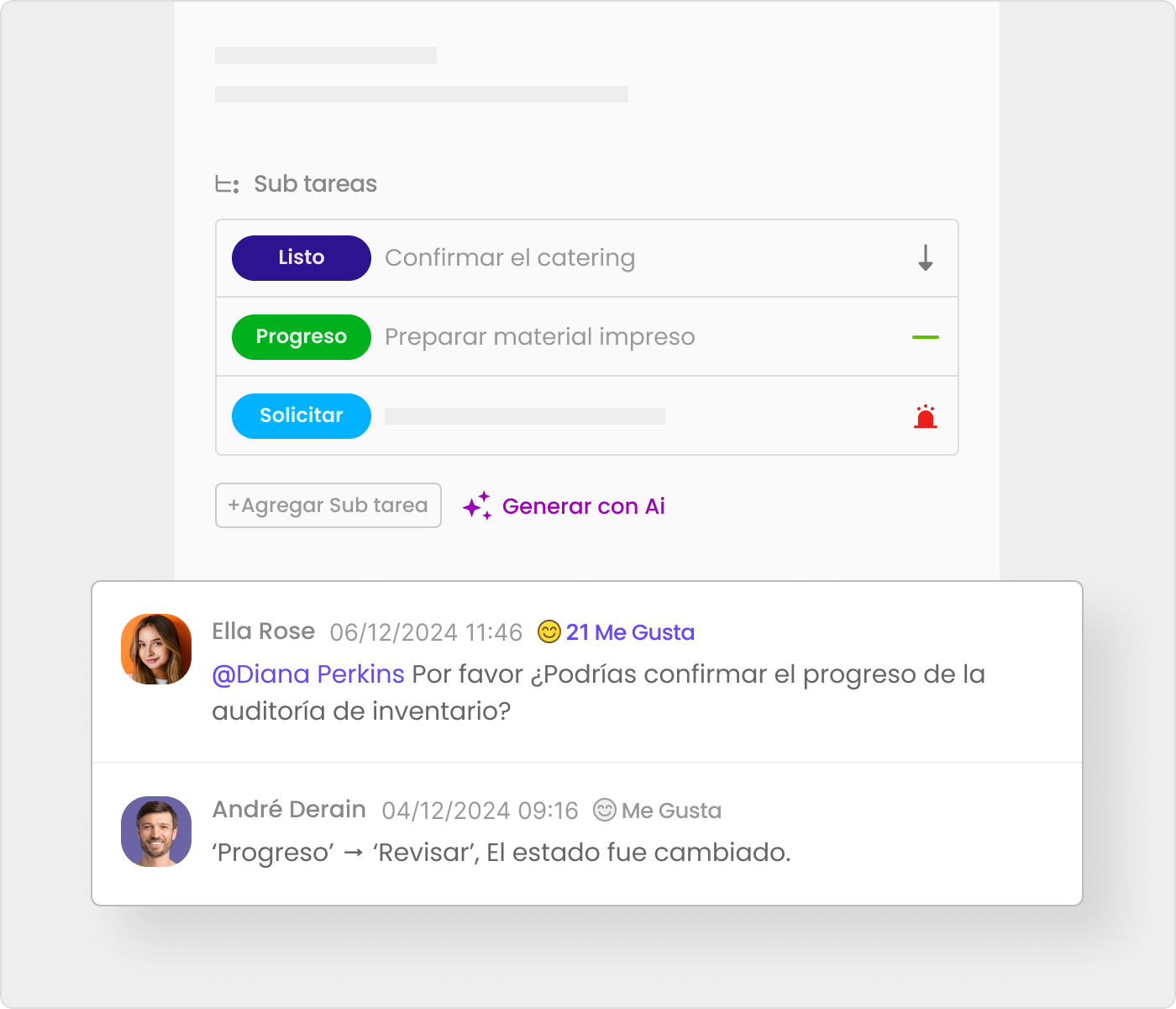 Tareas:Asigna responsables, fija las fechas y prioridad, haz seguimiento del progreso y agrega sub tareas