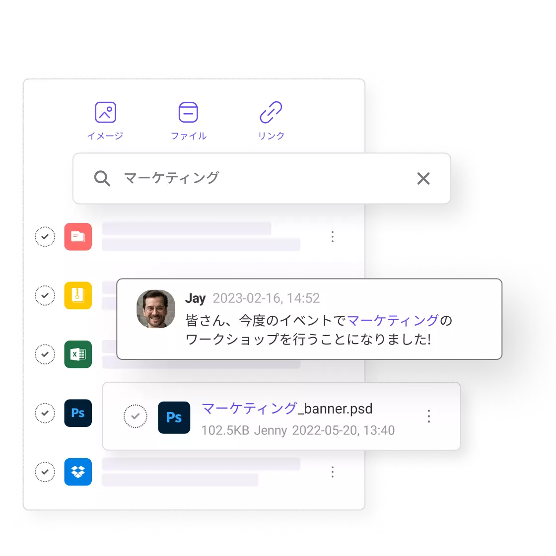 ファイルやリンクをチャットに直接添付して共有し、後で必要な時に簡単に検索できます。