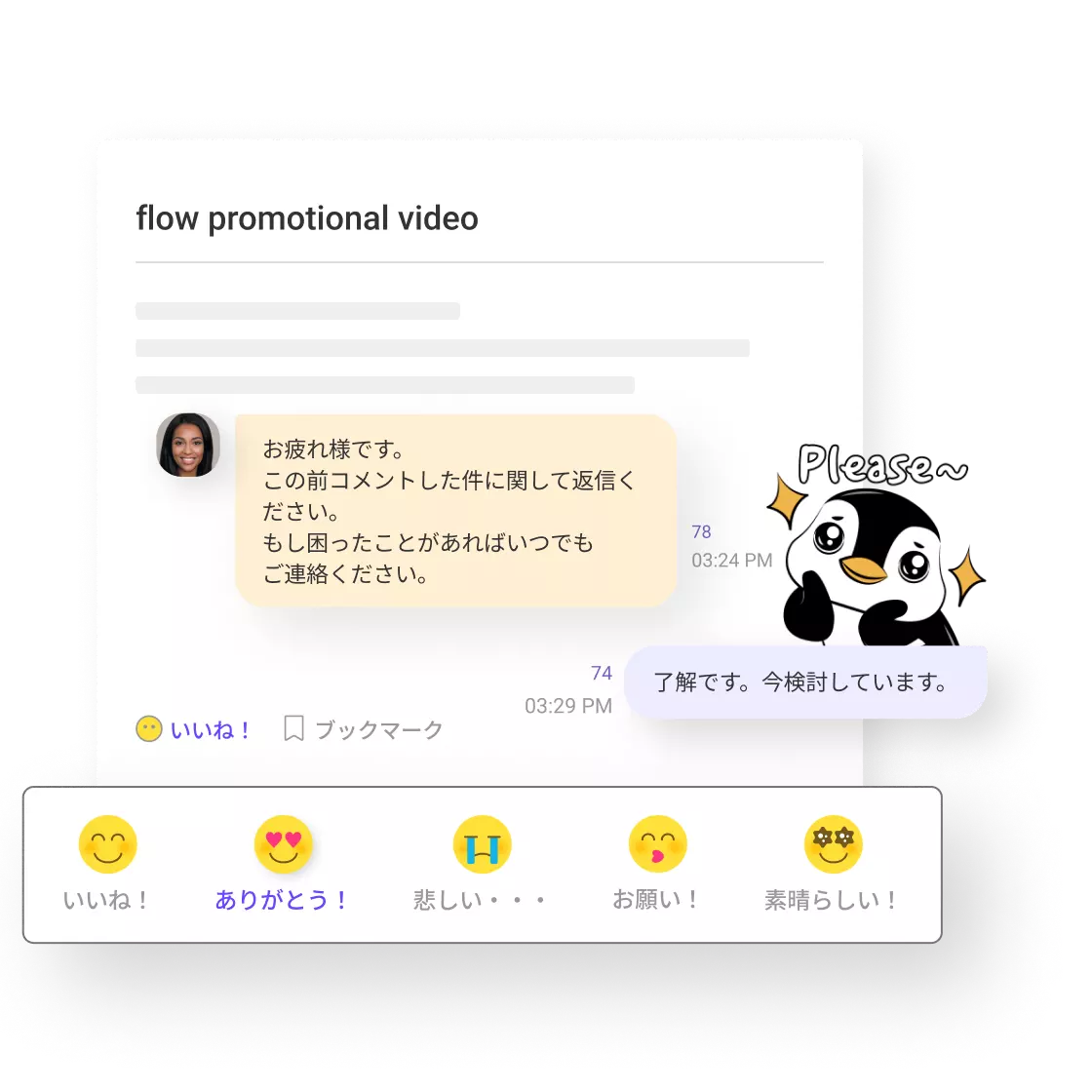 コメントにリアクションしたり、チャットのスタンプを活用して、メンバーに感謝の気持ちを伝えましょう。