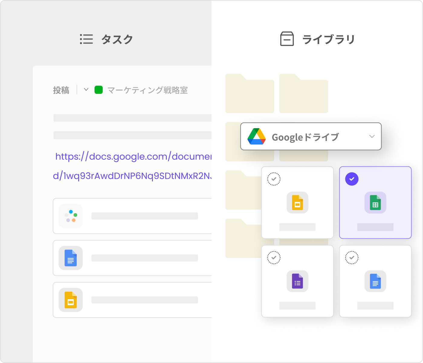 Googleドライブ内のファイルリンクを添付するだけで、ファイルタブ内で安全に保存します。