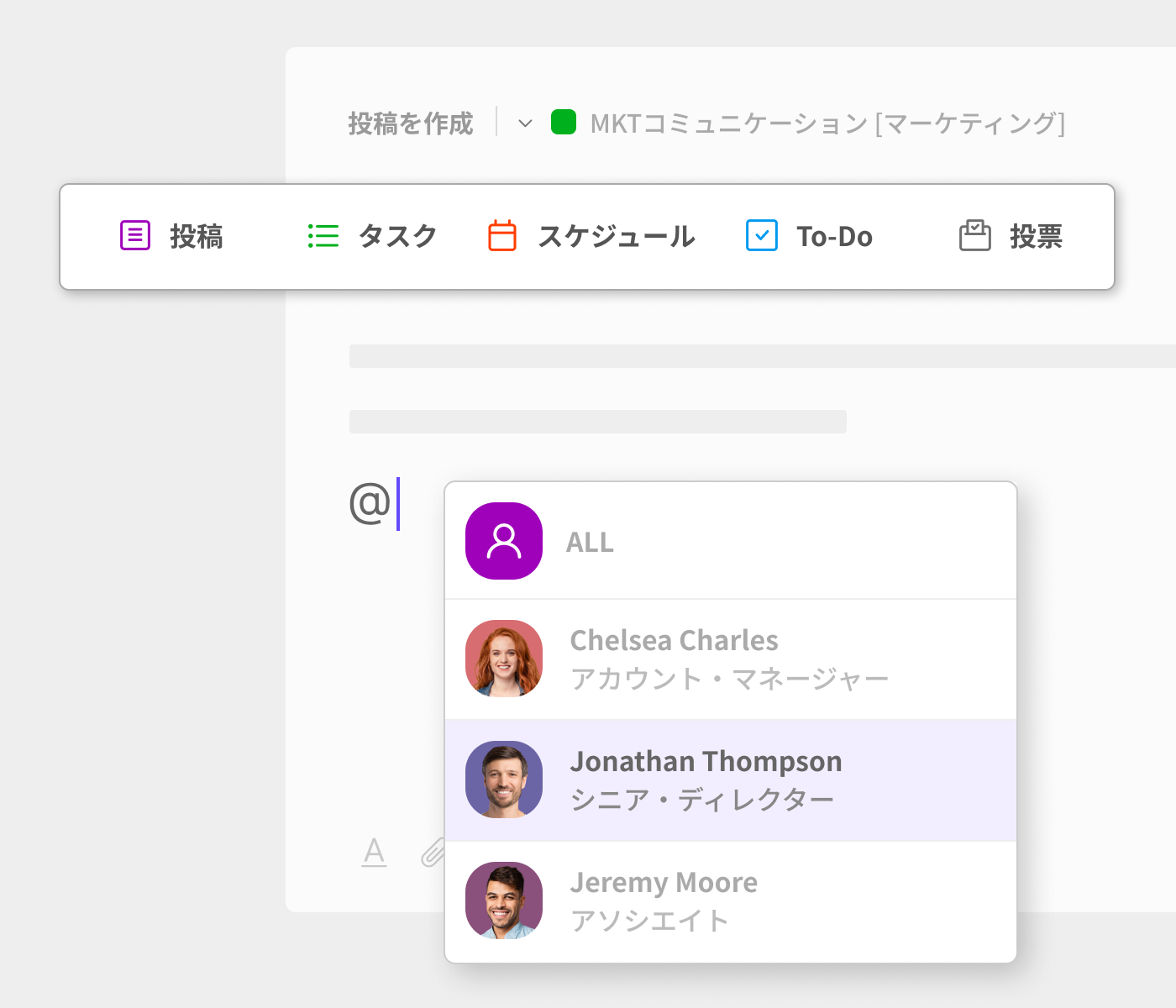 投稿はワークスペースに自由な順番で追加でき、テキスト、画像、ファイルなどさまざまなフォーマットが選択可能