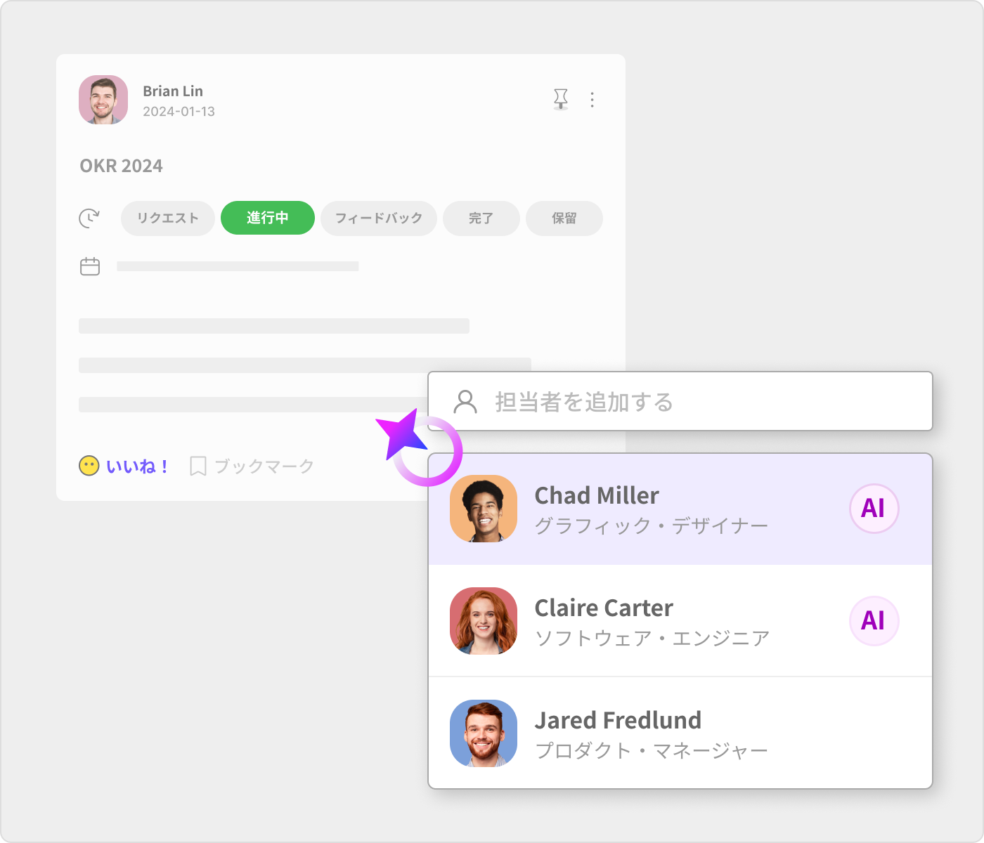 タグ付けと割り当て: 投稿やタスクにユーザをタグ付けして、業務を分担します