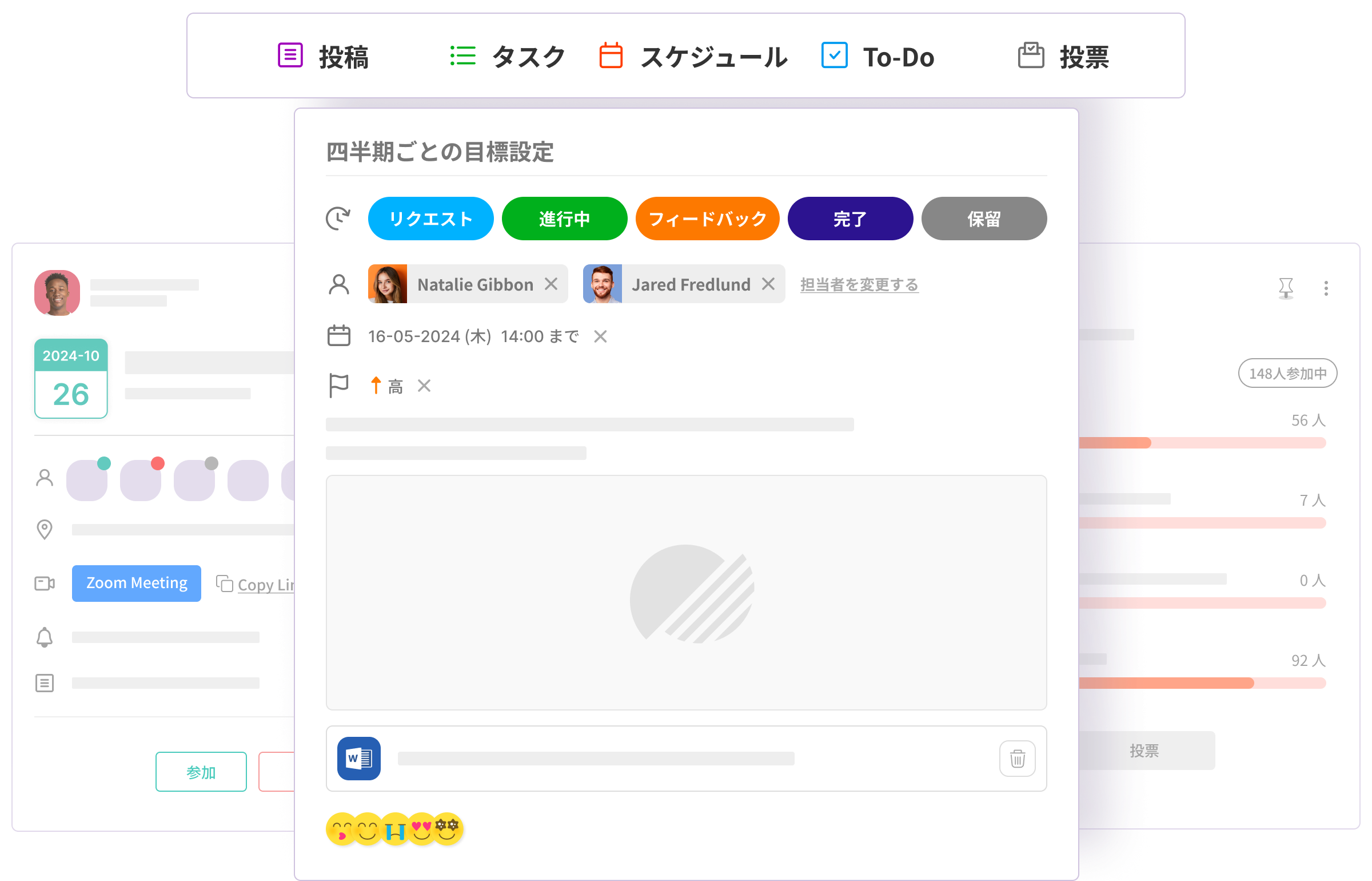 投稿 & タスク: タスクとその期日を設定し、チームと進捗を共有できます